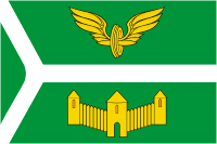 Прямоугольное двустороннее зеленое полотнище с отношением ширины к длине 2:3, разделенное обращенным и сдвинутым вправо узким белым вилообразным крестом, скругленным на углах и сопровождаемым вверху крылатым колесом, а внизу тремя башнями с островерхими крышами, средняя из которых больше и имеет открытые ворота; башни соединены палисадом; все сопровождающие фигуры желтые.